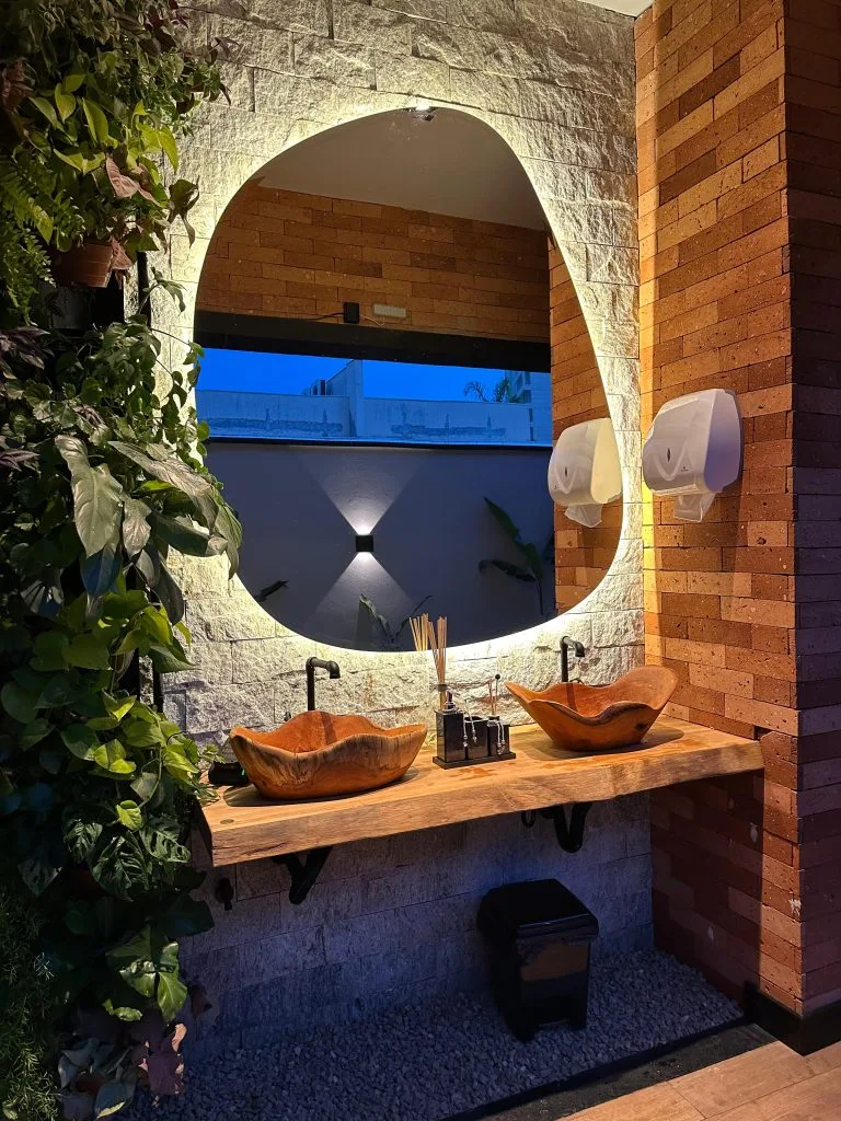 Aqui é onde o DNA da marca brilha: madeira natural, arte, e design.